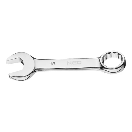 Klucz płasko-oczkowy NEO o wymiarze 18 x 131 mm, wykonany zgodnie z normą DIN 3113. Wysokogatunkowa stal chromowo-wanadowa zapewnia długoletnią wytrzymałość klucza. Krótkie ramię ułatwia pracę w trudno dostępnych miejscach. Jakość narzędzia potwierdzona certyfikatem TÜV i 25-letnią gwarancją producenta. Marka NEO spełnia oczekiwania profesjonalistów.