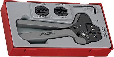 Zestaw zawiera narzędzie zaciskowe z trzema wymiennymi głowicami, do dołączania izolowanych i nieizolowanych końcówek do przewodów elektrycznych, oraz klucz trzpieniowy sześciokątny 2.5 mm. Dostarczany w pojemniku tworzywowym z odłączaną pokrywą. Pasuje do skrzynek i wózków narzędziowych Teng Tools.
