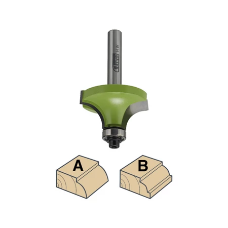 - Frezy zaokrąglające z ostrzami z węglików spiekanych i kulkowym łożyskiem prowadzącym wg rys. A. Frez może pracować z mniejszym łożyskiem dla uzyskania profilu B, patrz tabela z łożyskami alternatywnymi.