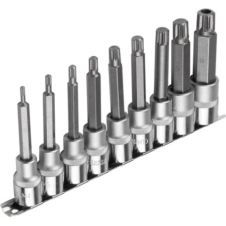 Zestaw 9 sztuk kluczy trzpieniowych SPLINE z uchwytem ½” w zakresie rozmiarów M4-M16 umieszczonych na metalowej listwie. Wykonane ze stali stopowej narzędziowej S2, charakteryzują się wysoką twardością (HRC 58-62) i zwiększona wytrzymałością na ścieranie. Szyna przeznaczona do montażu np. na ścianie w warsztacie. Każda nasadka w zestawie ma uporządkowane miejsce. Zastosowany organizer pozwala na łatwe uporządkowanie nasadek oraz szybki dostęp do każdej. Jakość premium.