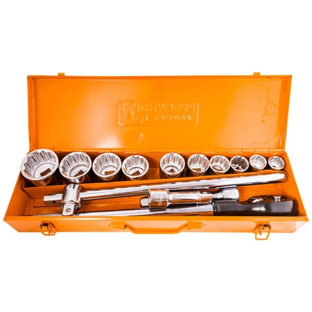 - 14 – elementowy zestaw kluczy nasadowych 12-kątnych z grzechotką 3/4" w zakresie rozmiarów 22-50 mm.