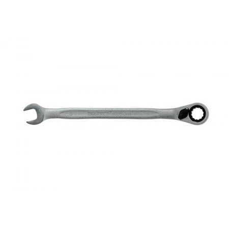 Ze stali chromowo-wanadowej. Klucz na jednym końcu wykonany jako oczkowy wygięty, a na drugim jako oczkowy 12-kątny, zapadkowy. Funkcja zapadkowa z przełączanym kierunkiem pracy prawo-lewo. Główka 12-kątna jest odgięta o 15°. Na obu końcach ten sam rozmiar.