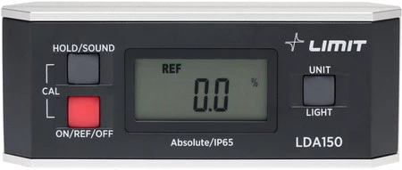 Cyfrowa poziomnica i kątomierz Limit w klasie IP65. Od spodu magnes i rowek pryzmatyczny. „0” może być ustawione w dowolnej pozycji. Funkcja pomiaru bezwzględnego pozwala wybierać czy wyświetlana ma być wartość odchyłki od 0 rzeczywistego, czy też od innego położenia przyjętego za 0. Wynik pomiaru można zatrzymać na wyświetlaczu w żądanej pozycji. Automatyczne wyłączanie. Baterie typu LR03, załączone 2 szt.