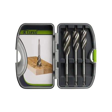 - Zestaw składający się z 3 wierteł 4-ostrzowych ze śrubą wciągającą i chwytem sześciokątnym 1/4″. Kręty kształt części roboczej zapewnia gładką powierzchnię otworu, a także bardzo dobre wciąganie osiowe. Dostarczany w etui z tworzywa sztucznego.