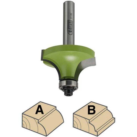 - Frezy zaokrąglające z ostrzami z węglików spiekanych i kulkowym łożyskiem prowadzącym wg rys. A. Frez może pracować z mniejszym łożyskiem dla uzyskania profilu B, patrz tabela z łożyskami alternatywnymi.