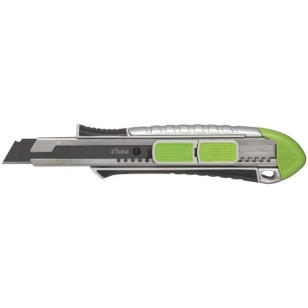 Bardzo mocny nóż z odłamywanym ostrzem, z obudową ze stopu cynku z miękkimi ergonomicznymi detalami z gumy, zwiększającymi wygodę użytkowania. Wysuwanie ostrza na dwa sposoby. Przedni przycisk wysuwa koniec ostrza na 15 mm i ma automatyczną sprężynę powrotną, doskonały do rozcinania opakowań i do innych szybkich cięć. Tylny przycisk wysuwa ostrze do żądanego występu. Tylną zatyczkę z tworzywa sztucznego można wyjąć i wykorzystać jako narzędzie do odłamywania segmentów ostrza. Dostarczany z ostrzem SK2H. Otwór do dołączenia zabezpieczenia narzędzia.