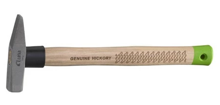 Luna Młotek ślusarski. Okuwany, lakierowany na czarno, z kwadratowym obuchem szlifowanym na płasko. Rąb poprzeczny, hartowany. Trzonek ekologiczny, z drewna hikorowego, osłona trzonka z gumy. Otwór do dołączenia zabezpieczenia narzędzia.