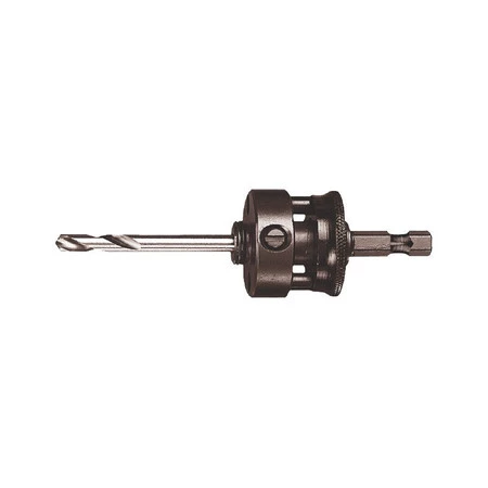 Oprawka do piły otworowej uniwersalna z wiertłem środkowym. Oprawki mają chwyt gwintowany z zabezpieczeniem kołkowym do zamocowania piły otworowej i chwyt sześciokątny do zamocowania w maszynie.