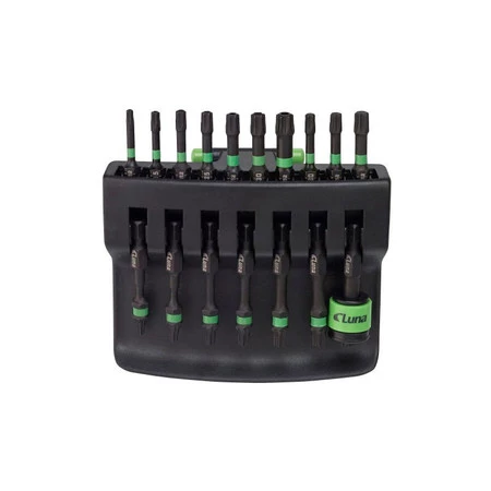 Zestaw grotów w uchwycie narzędziowym systemu Luna GO. Oryginalny uchwyt narzędziowy z zabezpieczeniem magnetycznym, z miejscem na 10 narzędzi wkładanych od góry i 7 zawieszanych. Do szybkiego i wygodnego użytkowania i przechowywanie narzędzi z chwytem sześciokątnym 1/4". Uchwyt narzędziowy ma budowę przegubową i może być łatwo dołączany do zamocowanego na pasie zaczepu Luna GO nr art. 24615-0106. Zestaw składa się z grotów Impact nadających się do wkrętarek udarowych.