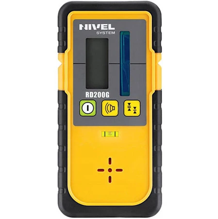 RD200G Nivel System to dekoder do zielonej wiązki laserowej, przeznaczony do pracy na otwartym terenie gdzie wiązka światła laserowego jest niewidoczna gołym okiem. Produkt wyposażony jest w dwa ekrany LCD, dzięki którym jesteśmy w stanie obserwować pomiary zarówno z jednej jak i z drugiej strony urządzenia. Odbiornik RD200G jest kompatybilny z większością laserów obrotowych. Posiada dwa tryby dokładności: tryb precyzyjny oraz tryb zgrubny. Urządzenie posiada głośnik emitujące 3 częstotliwości dźwięku. Dzięki temu bez patrzenia na detektor możemy określić czy pomiar wykonany jest za nisko, za wysoko lub idealnie w poziomie.