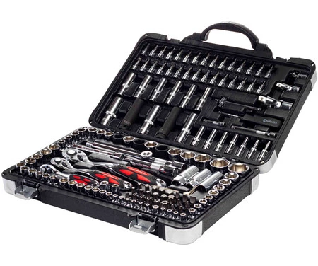 Zestaw kluczy nasadowych w walizce 150 części wykonanych ze stopu stali CR-V wytrzymałej na naprężenia statyczne i kinetyczne. Unikalna powłoka na powierzchni znacząco zwiększa komfort pracy oraz pozwala na utrzymanie narzędzi w czystości. Praktyczna i solidna walizka z tworzywa sztucznego z metalowymi zatrzaskami i poręcznym uchwytem.