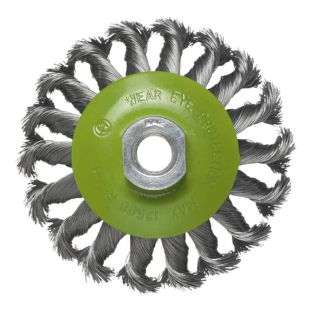 - Szczotka do czyszczenia o kształcie talerzowym. Elementy czyszczące splecione z mocnych drutów stalowych idealnie sprawdzą się do ciężkich prac przy oczyszczaniu powierzchni.