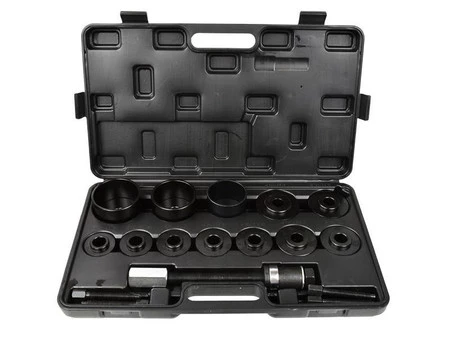 Zestaw do montażu i demontażu łożysk przedniej piasty bezpośrednio na samochodzie za pomocą łożyskowanej śruby ściągającej.