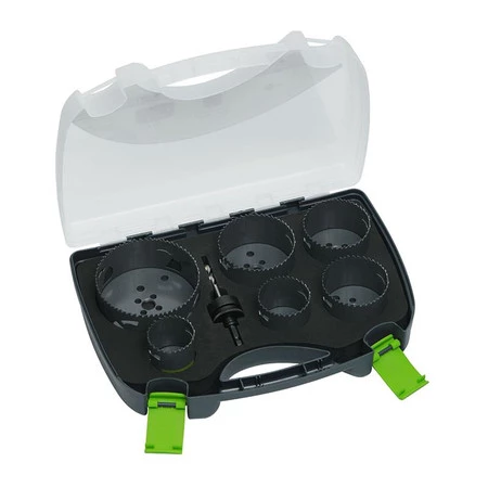 Zestawy pił otworowych LBH-2. Bimetalowe. Ostrza zębów wykonane z szybkotnącej stali z wysoką zawartością kobaltu, korpus ze stali narzędziowej o wysokiej wytrzymałości. Dzięki temu uzyskano większą odporność na zużycie i lepszą odporność termiczną. Efektywne uzębienie zmienne z dodatkowym łamaczem wióra zapewnia szybki przebieg cięcia oraz dobre odprowadzanie wiórów. Piły nadają się do wycinania otworów w metalu, drewnie i tworzywach sztucznych. Zestaw zawiera oprawkę do pił.