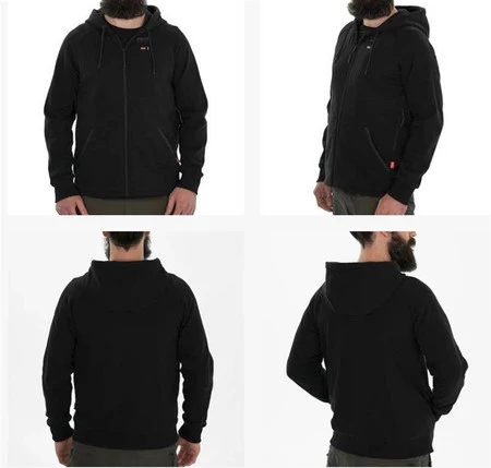 - Podgrzewana bluza z kapturem M12™ zasilana akumulatorem M12™ z elementami grzewczymi z włókna węglowego wytwarza i rozprowadza ciepło na klatkę piersiową i plecy.