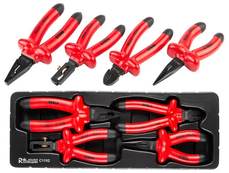 - Zestaw 4 sztuk izolowanych szczypiec umieszczonych we wkładzie do wózka warsztatowego.