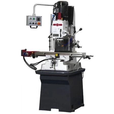 Obrabiarka uniwersalna do frezowania i wiercenia. Nadaje się do prac naprawczo-serwisowych i do celów szkoleniowych. Wiercenie i frezowanie mogą być wykonywane przy jednym zamocowaniu przedmiotu. Wrzeciono wiertarskie może być opuszczane szybko - za pomocą dźwigni posuwu współpracującej bezpośrednio z listwą zębatą, albo precyzyjnie - za pomocą pokrętła posuwu dokładnego. Mocowanie narzędzia odbywa się z użyciem śruby dociągającej z gwintem M 12. Głowica wiertarska jest przechylana o 90° w obu kierunkach. Prowadnice pryzmatyczne zapewniają dobrą stabilność głowicy i stołu. Dostarczana w komplecie z mechanicznym posuwem wzdłużnym, żeliwną podstawą, centralnym smarowaniem, 2-biegowym silnikiem, układem zabezpieczenia silnika z wyzwalaczem zanikowym, kompletnym wyposażeniem chłodzącym i automatyczną zmianą kierunku pracy z czujnikiem położenia. Cyfrowe urządzenie pomiarowe Limit - cena montażu podawana na zapytanie.