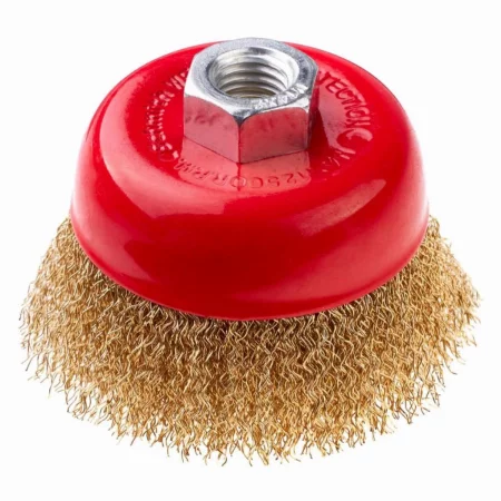 Druciana szczotka doczołowa, wykonana z mosiężnego, utwardzonego drutu falowanego, który zapewnia wydajną obróbkę zgrybną. Mocowanie jest kompatybilne ze szlifierkami kątowymi. Szczotka przeznaczona jest do usuwania rdzy, zendry, a także do czyszczenia powierzchni i spawów a także zdzierania farb.