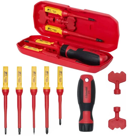 Zestaw wkrętaków VDE 8 szt Schmith to wysokiej jakości narzędzia zaprojektowane do pracy z instalacjami elektrycznymi. Dzięki izolacji VDE, narzędzia są przystosowane do bezpiecznego użytkowania pod napięciem do 1000V. Zestaw obejmuje różne typy wkrętaków płaskich i Phillips, które pokrywają szeroki zakres zastosowań w pracach elektrycznych. Wszystkie końcówki są wykonane z wytrzymałej stali S2, zapewniając długą żywotność oraz precyzyjne dopasowanie do śrub. Końcówki pokryte czarnym wykończeniem zwiększają odporność na zużycie.