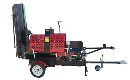 - Piło-łuparka wyposażona jest w podajnik taśmowy o długości 3,2 m który może transportować obrobione drewno bezpośrednio na przyczepę, maksymalna wysokość podawania drewna przez taśmociąg to 2 m