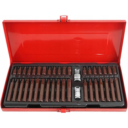 Profesjonalny zestaw bitów, służący do odkręcania śrub specjalnych typu: hex, torx, spline. Różnorodność bitów zapewnia możliwość wykonania wielu prac w specjalistycznych serwisach mechanicznych i samochodowych. Końcówki posiadają dwie długości 30 oraz 75 mm, mocowane w uchwycie sześciokątnym 10 mm, dostosowanym do współpracy z grzechotką 1/2' oraz 3/8'. Zestaw wykonany z najwyższej jakości stali stopowej narzędziowej S2, która charakteryzuje się wysoką twardością HRC 58-62 jednolitą, drobnoziarnistą strukturą materiału odpornością na skręcanie, wysokim momentem dokręcania - 21,8 Nm i doskonałym zahartowaniem