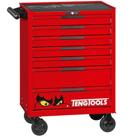Wózek 26-calowy, matowy, czerwony, zawierający 282 elementy, dla profesjonalistów z branży. Każda z 7 szuflad ma nośność 30 KG. 3-stopniowe prowadnice na łożyskach kulkowych i maty EVA dla ochrony. 3-częściowa, gruba stalowa rama szafki. Poddana 5-etapowemu procesowi zapobiegania rdzy bez fosforanów i wykończona powłoką proszkową zapewniającą trwałość. Wyposażony w 5-calowe kółka i wygodny uchwyt ułatwiający manewrowanie. System kontroli narzędzi TengTools zapewniający zorganizowane i dostępne narzędzia.