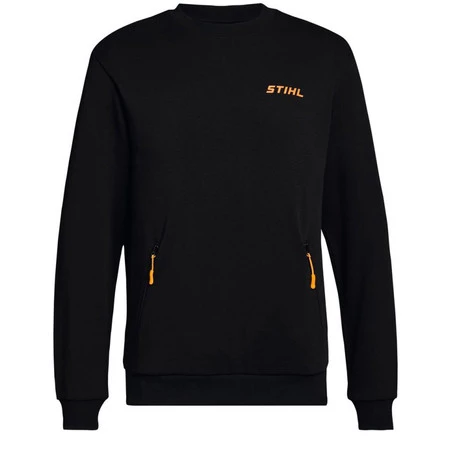 Prosta bluza STIHL w kolorze czarnym. Dwie przednie kieszenie zapinane na suwak i z pomarańczowym paskiem. Klatka piersiowa ozdobiona jest wypukłym nadrukiem 3D z logo STIHL.