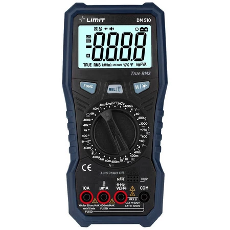 Multimetr Limit DM 510 to ręczny multimetr cyfrowy true RMS o wysokiej niezawodności i bezpieczeństwie (3999 zliczeń). Dzięki dużemu ekranowi, wyświetlaczowi o wysokiej rozdzielczości, zabezpieczeniu przed przeciążeniem i unikalnej konstrukcji jest to nowy i bardzo praktyczny multimetr cyfrowy. Miernik może mierzyć napięcie/prąd AC/DC, rezystancję, ciągłość, pojemność, częstotliwość, temperaturę i może być używany do testowania tranzystorów i diod itp. Podświetlany wyświetlacz ułatwia odczyt w ciemnym otoczeniu. Wbudowana latarka ułatwiająca znajdowanie połączeń w ciemnych miejscach. Wyposażony w funkcje podtrzymania danych, wskazania niskiego poziomu baterii, automatycznego wyłączania zasilania, identyfikacji przewodu pod napięciem i bezdotykowego wykrywania napięcia (NCV), miernik jest idealny do wielu zastosowań.