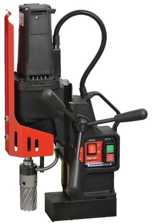 Model PRO-50 wyposażony jest w specjalnie zaprojektowany silnik i 2-biegową przekładnię. Obroty silnika 240 i 480 obr/min są zoptymalizowane pod kątem zapewnienia odpowiedniej prędkości do pracy z frezami HSS do Ф 50 mm oraz cylindrycznymi wiertłami krętymi do Ф 23 mm. Wiertarka z podstawą elektromagnetyczną PRO 50 wyposażona jest w gniazdo narzędziowe stożka Morse'a 2. Sztywna konstrukcja zoptymalizowana za pomocą oprogramowania FEA (analizy elementów skończonych) wydłuża żywotność narzędzia. Kompaktowa konstrukcja wraz z innowacyjnym, inteligentnym magnesem o zmniejszonej wadze sprawiają, że jest to lekka maszyna. Wiertarka elektromagnetyczna PRO-50 zapewnia maksymalną siłę trzymania na cienkich materiałach dzięki kontroli kształtu pola magnetycznego (MFSC). Wiertarka i operator są chronieni przed pracą na zbyt cienkim elemencie za pomocą systemu kontroli przyczepności magnetycznej (MPAC). Wiertarka magnetyczna PRO-50 jest również wyposażona w podstawę magnetyczną oszczędzającą energię (ESB), która zużywa tylko 50% swojej mocy, gdy silnik nie pracuje.