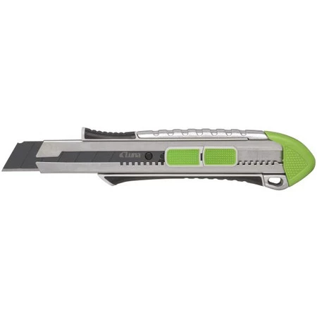 Bardzo mocny nóż z odłamywanym ostrzem, z obudową ze stopu cynku z miękkimi ergonomicznymi detalami z gumy, zwiększającymi wygodę użytkowania. Wysuwanie ostrza na dwa sposoby. Przedni przycisk wysuwa koniec ostrza na 15 mm i ma automatyczną sprężynę powrotną, doskonały do rozcinania opakowań i do innych szybkich cięć. Tylny przycisk wysuwa ostrze do żądanego występu. Tylną zatyczkę z tworzywa sztucznego można wyjąć i wykorzystać jako narzędzie do odłamywania segmentów ostrza. Dostarczany z ostrzem SK2H. Otwór do dołączenia zabezpieczenia narzędzia.