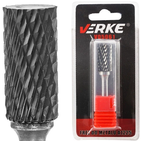 Frez A1225 VERKE posiada podwójne ostrza naprzemianskośne przeznaczone do ogólnego użytku, tworzą krótkie wióra łatwe do odprowadzania i pozwalają na równomierną pracę przy obróbce stali ciągliwych. Idealne do kształtowania, wygładzania i usuwania materiałów takich jak: stal utwardzona (HRC65), stal nierdzewna, żeliwo, metale kolorowe, ceramika, tworzywa sztuczne, drewno. Frez wykonany jest z węglika wolframu, połączenie to charakteryzuje się najwyższą (6000 °C) temperaturę wrzenia spośród znanych związków oraz ogromną wytrzymałością.