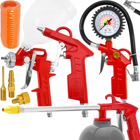Zestaw 8 narzędzi pneumatycznych do malowania, pompowania, przedmuchiwania i ropowania. Ciśnienie robocze 2-10 bar