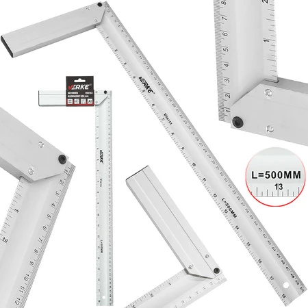 Kątownik aluminiowy o długości 500 mm. Wykonany z utwardzanego aluminium. Podziałka naniesiona w sposób trwały w kolorze czarnym. Posiada podziałkę milimetrową oraz calową. Pozwala na wykonywanie precyzyjnych pomiarów, wyznaczania kąta prostego oraz trasowania podczas prac stolarskich, budowlanych i pomiarowych.