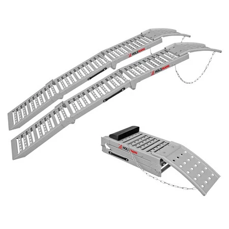 Ta para ramp ułatwia załadunek mniejszych maszyn na przyczepę, furgonetkę itp. Możliwość podwójnego zastosowania: po złożeniu maksymalne obciążenie wynosi 2300 kg, a po rozłożeniu – 460 kg. Można jej używać do załadunku takich pojazdów jak: mini wywrotki, kosiarki, quady. Ta rampa załadunkowa ma szerokość 225 mm, co pozwala na załadunek produktów z nieco szerszymi kołami.