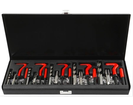 Wysokiej jakości zestaw do naprawy gwintów pozwalający na zastąpienie zniszczonych gwintów nową wkładką gwintową. Wiertła i gwintowniki wykonane zostały ze stali szybkotnącej HSS. Gwintowniki jednostopniowe nacinają gwint, w który wprowadza się wkładkę spiralną z twardej stali nierdzewnej. Do wprowadzenia wkładki służy pokrętło prowadzące oraz wybijak, który obłamuje wystającą końcówkę wkładki.