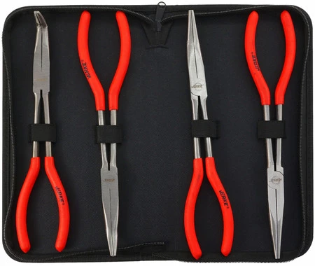 Profesjonalny zestaw szczypiec 11", 280mm. Szczypce wydłużone proste oraz gięte uniwersalne do chwytania przedmiotów płaskich i okrągłych, wykonane z wysokogatunkowej stali chromowo-wanadowej. Mają wszechstronne zastosowanie zarówno w przemyśle jak i serwisach czy warsztatach. Rękojeści osłonięte miękkimi nakładkami z tworzywa. Całość zapakowana w praktyczny zasuwany pokrowiec.