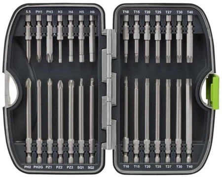 Zestaw 28 różnych grotów wkrętakowych. Dostarczany w etui z tworzywa. Chwyt sześciokątny 1/4″.