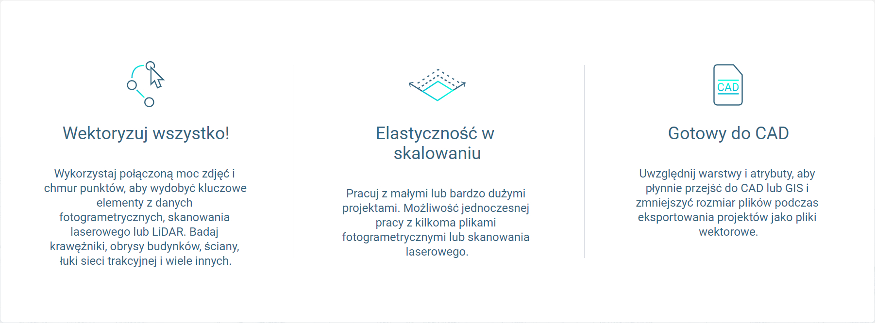 ![]() | IntegrujOtwórz swoje dane w dowolnym oprogramowaniu CAD lub GIS z indywidualnymi warstwami i właściwościami, które pasują do istniejącego schematu pracy. |