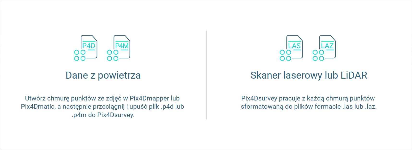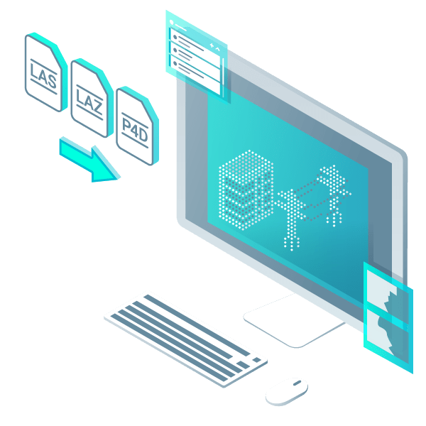 Pix4Dsurvey współpracuje z Twoimi dotychczasowym systemem pracy. Importuj pliki .p4d z Pix4Dmapper za pomocą jednego przycisku, lub pracuj z plikami w formacie LAS.