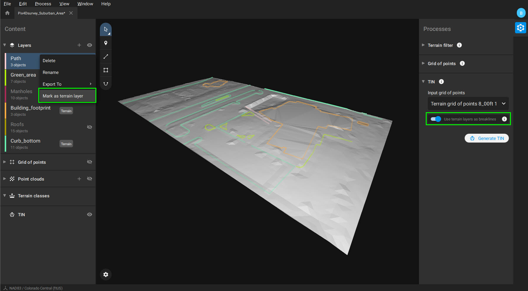 WektoryzujWygeneruj numeryczny model terenu TIN, aby wymodelować obszar i utwórz pliki wektorowe CAD z chmury punktów, wyodrębniając kluczowe elementy projektu za pomocą Pix4Dsurvey. |