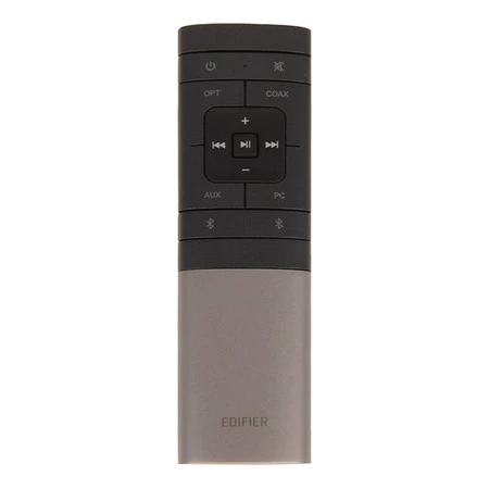 Przejmij pełną kontrolę nad playlistą. Pilot pozwala sterować zestawem głośników 2.1 Edifier S351DB na odległość. Z jego poziomu wybierzesz źródło dźwięku (OPT, COAX, AUX, PC, Bluetooth), dostosujesz poziom głośności, wyciszysz odtwarzanie, pominiesz utwór lub włączysz/wyłączysz głośniki. Pilot jest zasilany 2 bateriami AAA.