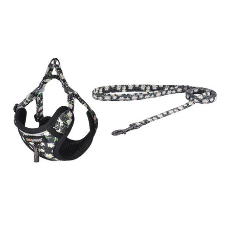 Zarówno smycz, jak i szelki zostały wykonane z trwałych materiałów – nylonu, siatki i stopu cynku. Nylon zapewnia wytrzymałość, siatka oddychalność, a elementy ze stopu cynku gwarantują solidne zapięcia. Dzięki temu zestaw jest nie tylko estetyczny, ale także bardzo wytrzymały.