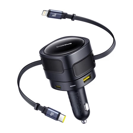 Ładowarka samochodowa Baseus z dwoma wbudowanymi kablami (USB-C i Lightning) i dwoma dodatkowymi portami (USB-C i USB-A) pozwala ładować jednocześnie aż cztery urządzenia z łączną mocą do 90 W. Zintegrowany system bezpieczeństwa, obrotowa konstrukcja i kompatybilność z napięciem 12–24 V zapewniają niezawodność w każdym pojeździe.
